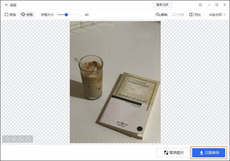 水印去除之后可以在页面中预览效果,没问题的话可以点击【立即保存】按钮获取去掉水印后的图片。